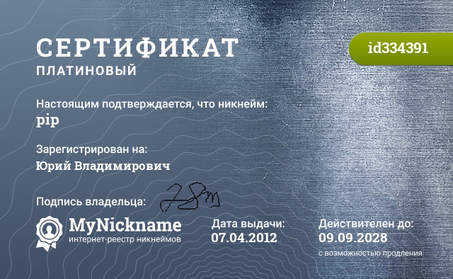 Nickname pip is registered to Yuri Vladimirovich. Issued certificate ID334391. Issue date 07.04.2012.