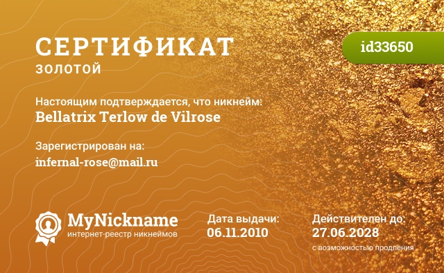 Nickname Bellatrix Terlow de Vilrose is registered to infernal-rose@mail.ru. Issued certificate ID33650. Issue date 06.11.2010.