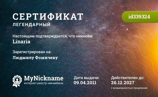 Nickname Linaria is registered to Lyudmila Fomichev. Issued certificate ID339324. Issue date 09.04.2011.