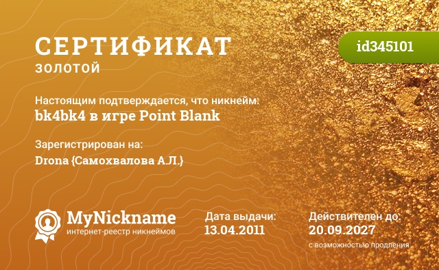Никнейм bk4bk4 в игре Point Blank зарегистрирован на Drona {Самохвалова А.Л.}. Выдан сертификат id345101. Дата выдачи 13.04.2011.