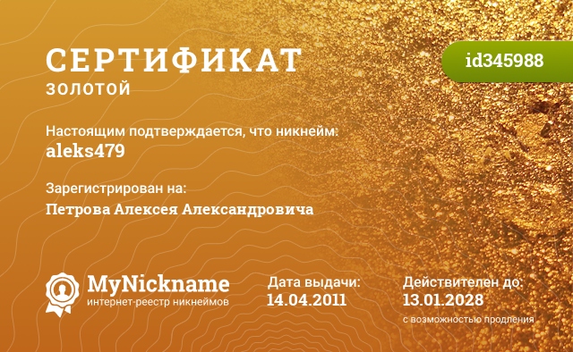 Nickname aleks479 is registered to Petrov Alexey Alexandrovich. Issued certificate ID345988. Issue date 14.04.2011.