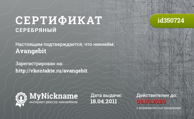 Nickname Avangebit is registered to http://vkontakte.ru/avangebit. Issued certificate ID350724. Issue date 18.04.2011.