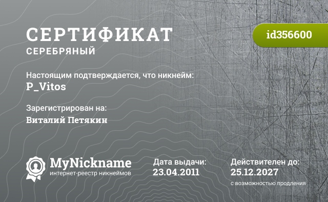 Nickname P_Vitos is registered to Vitaly Petyakin. Issued certificate ID356600. Issue date 23.04.2011.