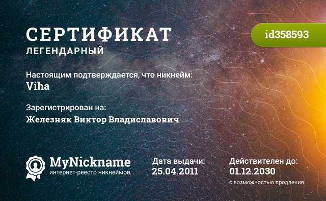 Nickname Viha is registered to Zhelezniak Viktor Vladislavovich. Issued certificate ID358593. Issue date 25.04.2011.