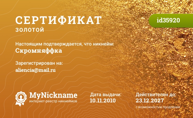 Nickname Скромняффка is registered to aliencia@mail.ru. Issued certificate ID35920. Issue date 10.11.2010.