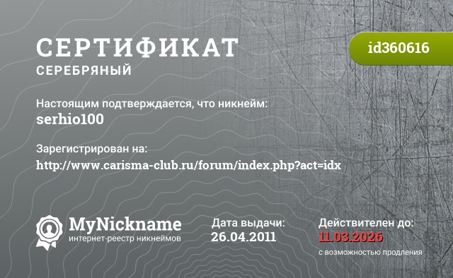 Никнейм serhio100 зарегистрирован на http://www.carisma-club.ru/forum/index.php?act=idx. Выдан сертификат id360616. Дата выдачи 26.04.2011.