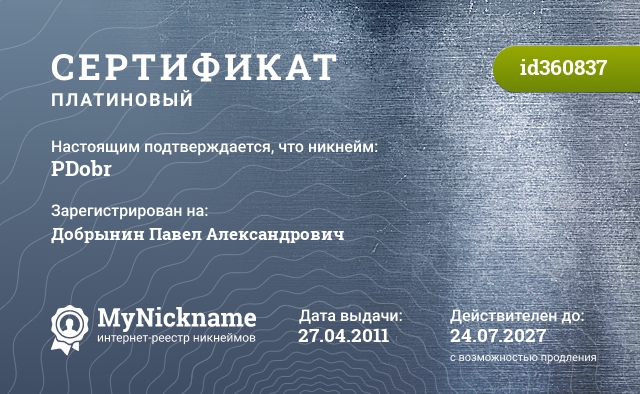 Nickname PDobr is registered to Dobrynin Pavel Alexandrovich. Issued certificate ID360837. Issue date 27.04.2011.
