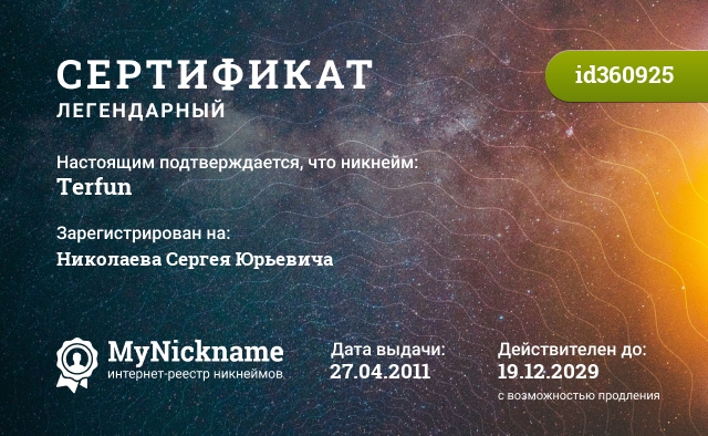Nickname Terfun is registered to Nikolaev Sergei Yurievich. Issued certificate ID360925. Issue date 27.04.2011.