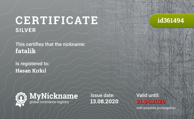 Nickname fatalik is registered to Hasan Kırkıl. Issued certificate ID361494. Issue date 13.08.2020.