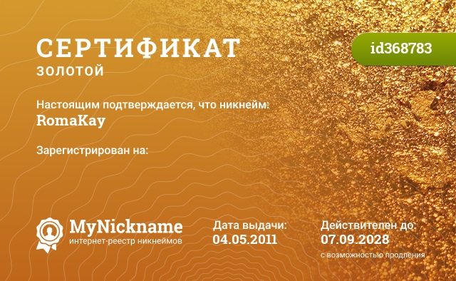 Nickname RomaKay is registered to . Issued certificate ID368783. Issue date 04.05.2011.
