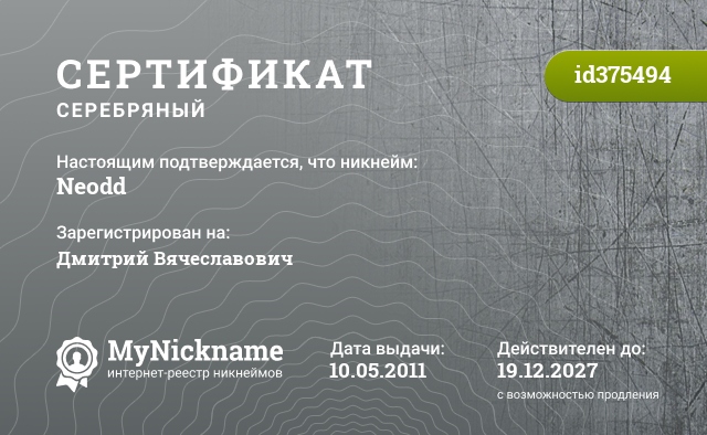 Nickname Neodd is registered to Dmitry Vyacheslavovich. Issued certificate ID375494. Issue date 10.05.2011.