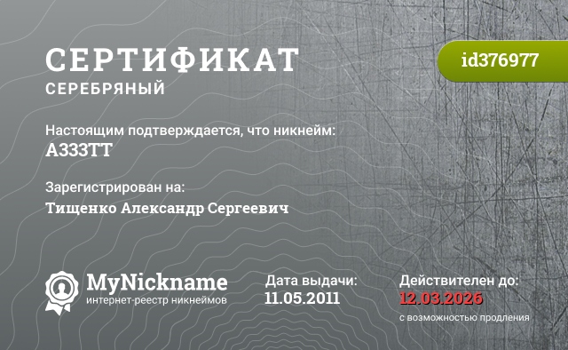 Никнейм A333TT зарегистрирован на Тищенко Александр Сергеевич. Выдан сертификат id376977. Дата выдачи 11.05.2011.