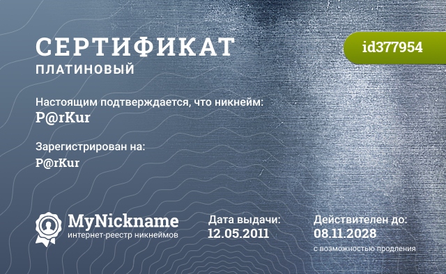 Nickname P@rKur is registered to P@rKur. Issued certificate ID377954. Issue date 12.05.2011.