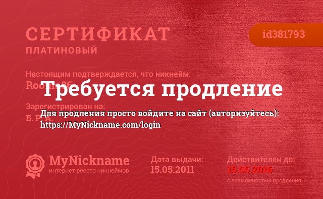 Nickname Rooma86 is registered to Б. Р. А.. Issued certificate ID381793. Issue date 15.05.2011.