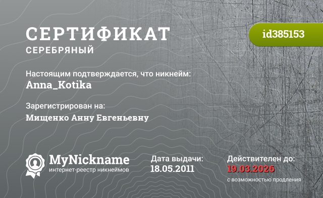 Nickname Anna_Kotika is registered to Mishchenko Anna Evgenievna. Issued certificate ID385153. Issue date 18.05.2011.