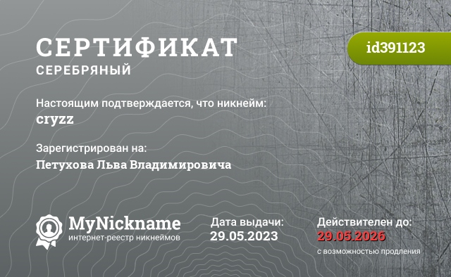 Certificate for nickname cryzz is registered to: Petukhov Lev Vladimirovich