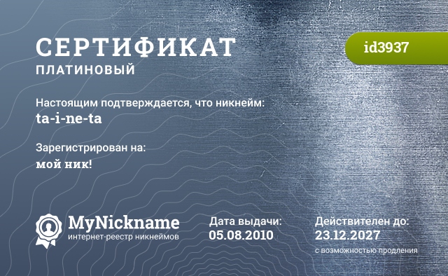 Nickname ta-i-ne-ta is registered to my nickname!. Issued certificate ID3937. Issue date 05.08.2010.
