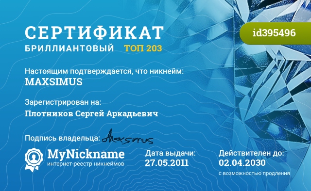 Nickname MАХSIМUS is registered to Plotnikov Sergey Arkadevich. Issued certificate ID395496. Issue date 27.05.2011.
