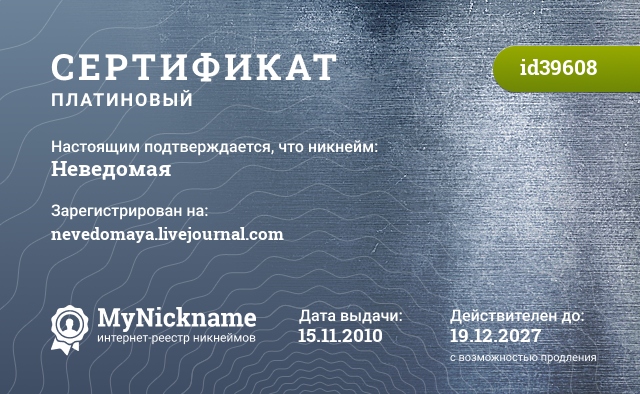 Nickname Неведомая is registered to nevedomaya.livejournal.com. Issued certificate ID39608. Issue date 15.11.2010.