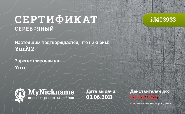 Никнейм Yuri92 зарегистрирован на Yuri. Выдан сертификат id403933. Дата выдачи 03.06.2011.