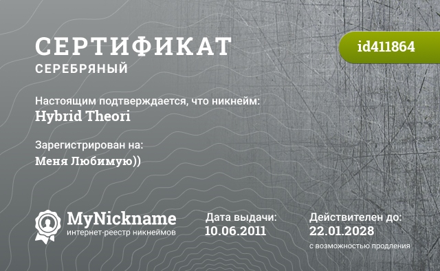 Nickname Hybrid Theori is registered to Me, my love)). Issued certificate ID411864. Issue date 10.06.2011.