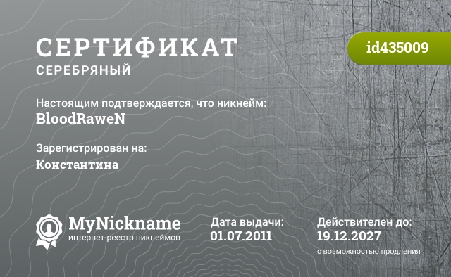 Nickname BloodRaweN is registered to Constantine. Issued certificate ID435009. Issue date 01.07.2011.