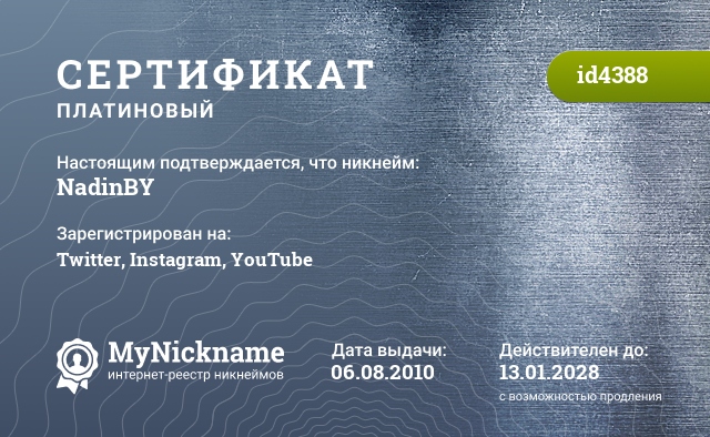 Nickname NadinBY is registered to Twitter, Instagram, YouTube. Issued certificate ID4388. Issue date 06.08.2010.