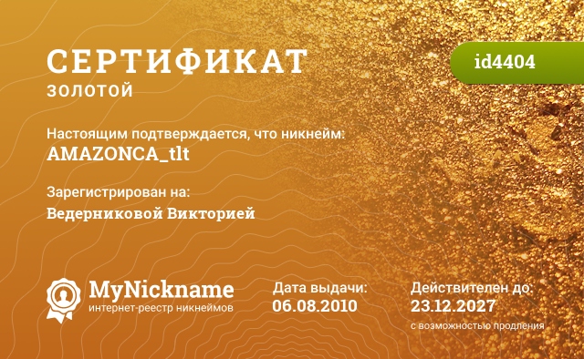 Nickname AMAZONCA_tlt is registered to Vedernikova Victoria. Issued certificate ID4404. Issue date 06.08.2010.