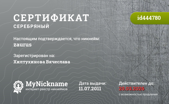 Nickname zaurus is registered to Khiltukhinova Vyacheslav. Issued certificate ID444780. Issue date 11.07.2011.