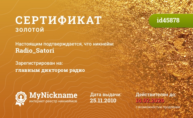 Nickname Radio_Satori is registered to chief radio announcer. Issued certificate ID45878. Issue date 25.11.2010.