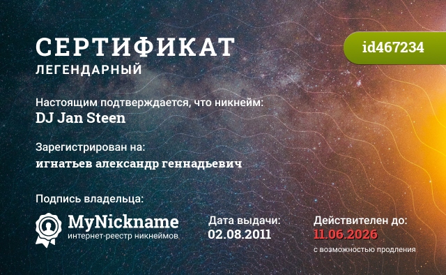 Nickname DJ Jan Steen is registered to Ignatiev Alexander Gennadievich. Issued certificate ID467234. Issue date 02.08.2011.