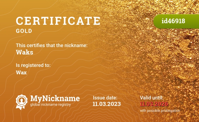 Никнейм Waks зарегистрирован на Waks. Выдан сертификат id46918. Дата выдачи 11.03.2023.