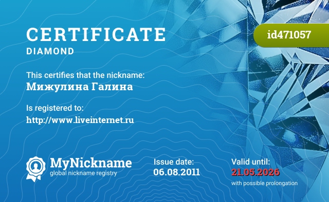 Nickname Мижулина Галина is registered to http://www.liveinternet.ru. Issued certificate ID471057. Issue date 06.08.2011.