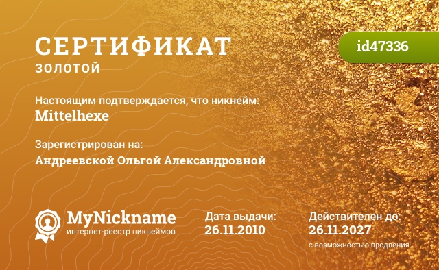 Nickname Mittelhexe is registered to Andreevskaya Olga Alexandrovna. Issued certificate ID47336. Issue date 26.11.2010.