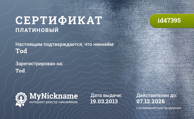 Nickname Tod is registered to Tod. Issued certificate ID47395. Issue date 19.03.2013.