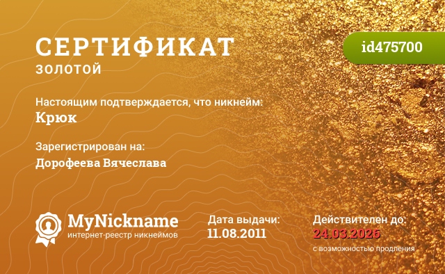 Никнейм Крюк зарегистрирован на Дорофеева Вячеслава. Выдан сертификат id475700. Дата выдачи 11.08.2011.