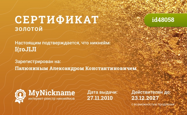 Nickname I{roJIJI is registered to Palyunin Alexander Konstantinovich. Issued certificate ID48058. Issue date 27.11.2010.