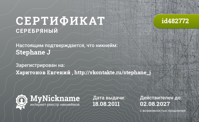 Nickname Stephane J is registered to Kharitonov Evgeniy, http://vkontakte.ru/stephane_j. Issued Silver certificate ID482772. Issue date 18.08.2011.