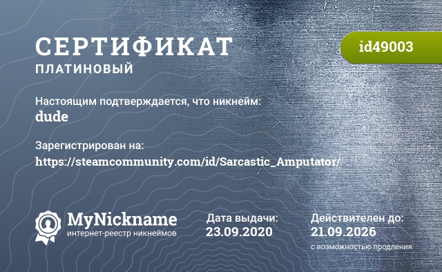 Nickname dude is registered to https://steamcommunity.com/id/Sarcastic_Amputator/. Issued Platinum certificate ID49003. Issue date 23.09.2020.
