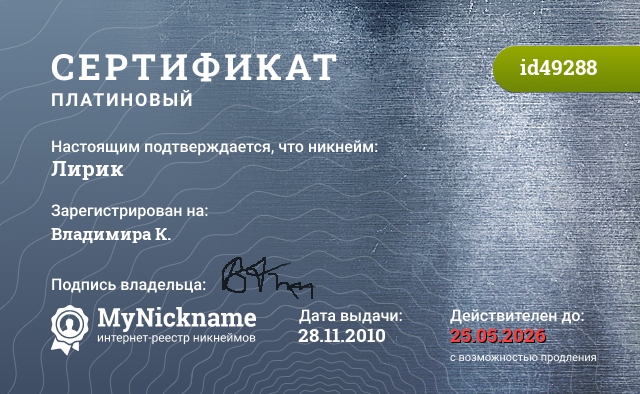 Nickname Лирик is registered to Vladimir K.. Issued certificate ID49288. Issue date 28.11.2010.