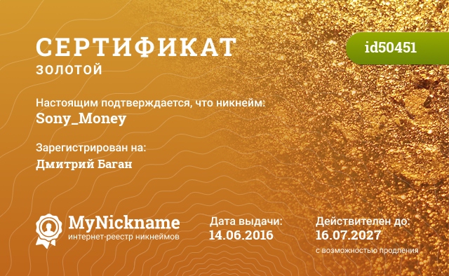 Никнейм Sony_Money зарегистрирован на Дмитрий Баган . Выдан сертификат id50451. Дата выдачи 14.06.2016.