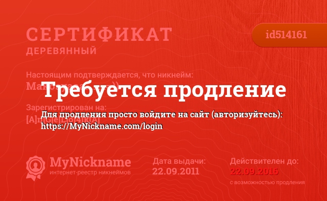Nickname Makosyaaa........=)) is registered to [A]n[G]e[L]o[4]k[A]. Issued Wooden certificate ID514161. Issue date 22.09.2011.