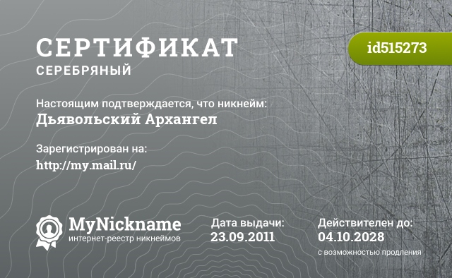 Серебряный ? сертификат на никнейм Дьявольский Архангел (id515273)