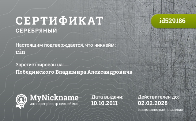 Никнейм cin зарегистрирован на Побединского Владимира Александровича. Выдан сертификат id529186. Дата выдачи 10.10.2011.