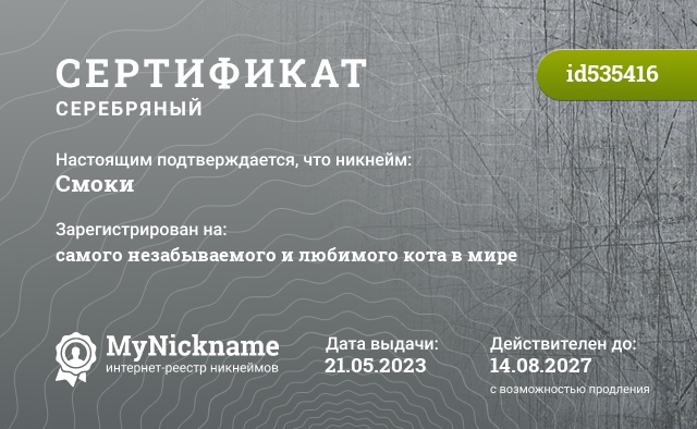 certificate for nickname: Смоки (id535416)