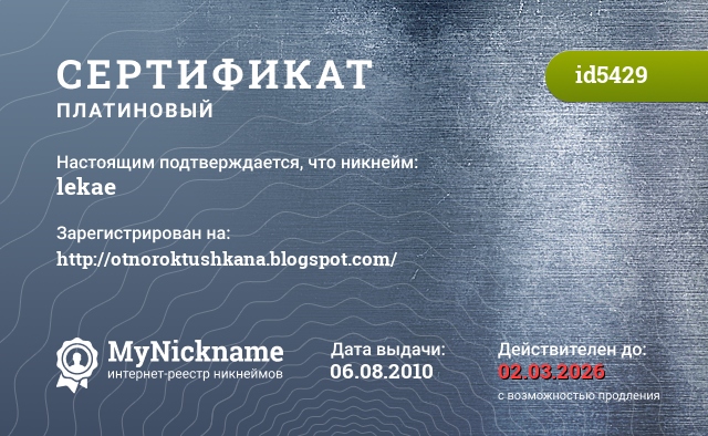 Nickname lekae is registered to http://otnoroktushkana.blogspot.com/. Issued Platinum certificate ID5429. Issue date 06.08.2010.