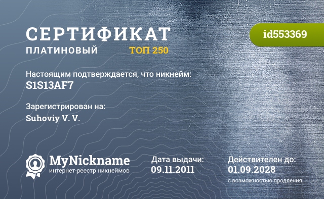 Nickname S1S13AF7 is registered to Suhovi VV. Issued certificate ID553369. Issue date 09.11.2011.