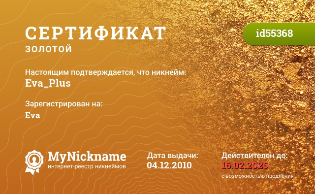 Золотой ? сертификат на никнейм Eva_Plus (id55368)