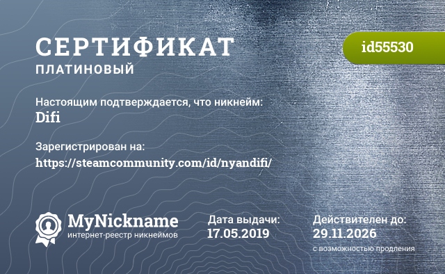 Никнейм Difi зарегистрирован на https://steamcommunity.com/id/nyandifi/. Выдан сертификат id55530. Дата выдачи 17.05.2019.