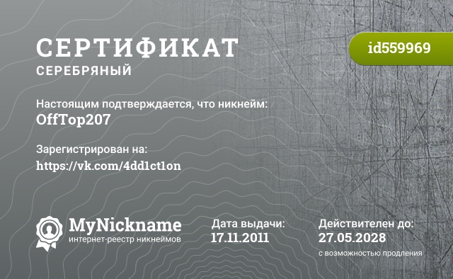 Nickname OffTop207 is registered to https://vk.com/4dd1ct1on. Issued certificate ID559969. Issue date 17.11.2011.